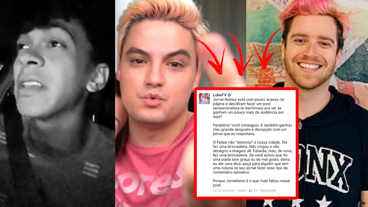 0:53 – Felipe Neto está sendo acusado pelo jornal “NotiSul” de xingar e denegrir a imagem da cidade de Tubarão: “O famoso youtuber Felipe Neto Rodrigues Vieira, do Rio de Janeiro, detonou o municipio de Tubarao em video publicado nesta segunda feira 27 em seu canal no Youtube. Xingou e denegriu a cidade azul.” Para quem não sabe, Tubarão é a cidade natal da namorada de Felipe e do tb Youtuber Luba que decidiu sair em defesa do colega dizendo que o jornal fez um post “sensacionalista e mentiroso”: “Jornal NotiSul esta com pouco acesso na pagina e decidiram fazer um post sensacionalista e mentiroso pra ver se ganham um pouco mais de audiencia por aqui? O Felipe não detonou nossa cidade ele fez uma brincadeira. Não xingou e não denegriu a imagem de Tubarão. Se vc achou que foi uma piada sem graça ou de mal gosto, peça para alguém que tem uma coluna em seu jornal fazer esse tipo de comentário opinativo. Porque Jornalismo é o que mais faltou nesse post.” No Twitter Felipe disse que depois do posicionamento de Luba o Jornal apagou o post: “Falei q minha namorada é de Tubarão, q fica la no cu do mundo de longe. Eis q um JORNAL escreve isso e o @LubaTV me defende. Eles apagaram. Como q um jornal feito por jornalistas dá a notícia MENTIROSA de q eu xinguei e denegri uma cidade? E ainda mentem q eu respondo a processos. Sinceramente @jornalnotisul eu gostaria q vcs me dessem um motivo para não processá-los por isso. Façam o favor de postar uma retratação aí.” Luba “retuitou” o post do coleguinha.