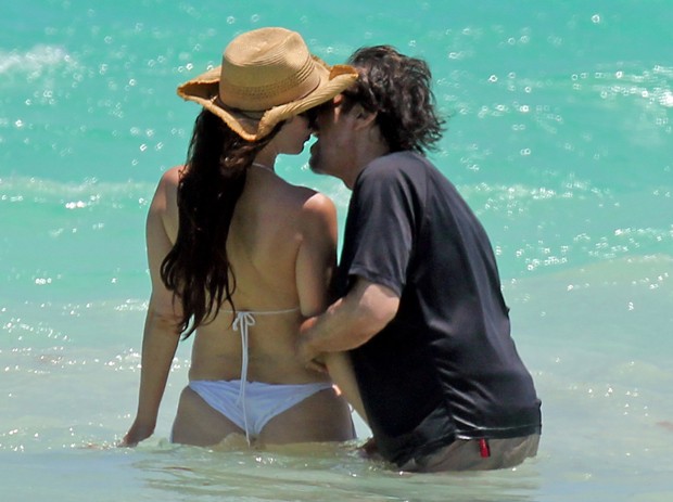 Enquanto ela aproveitava o sol, usando um biquíni branco, Al Pacino preferiu se proteger e optou por usar uma bermuda bege e uma camiseta preta.